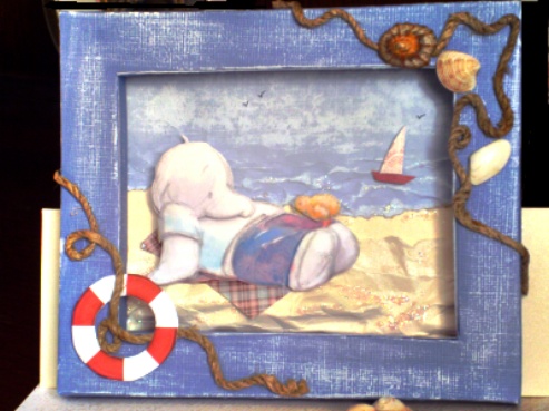 I started by printing off the frame from the Adorables cd and glued it to a piece of blue Coordinations paper. Made up the frame and sanded it back to give a weathered look. The picture background I made from cream crumpled card for the beach and a lighter blue coordinations paper for the sea and sky- crumpling the bottom part for the sea and sanding back the sky .
